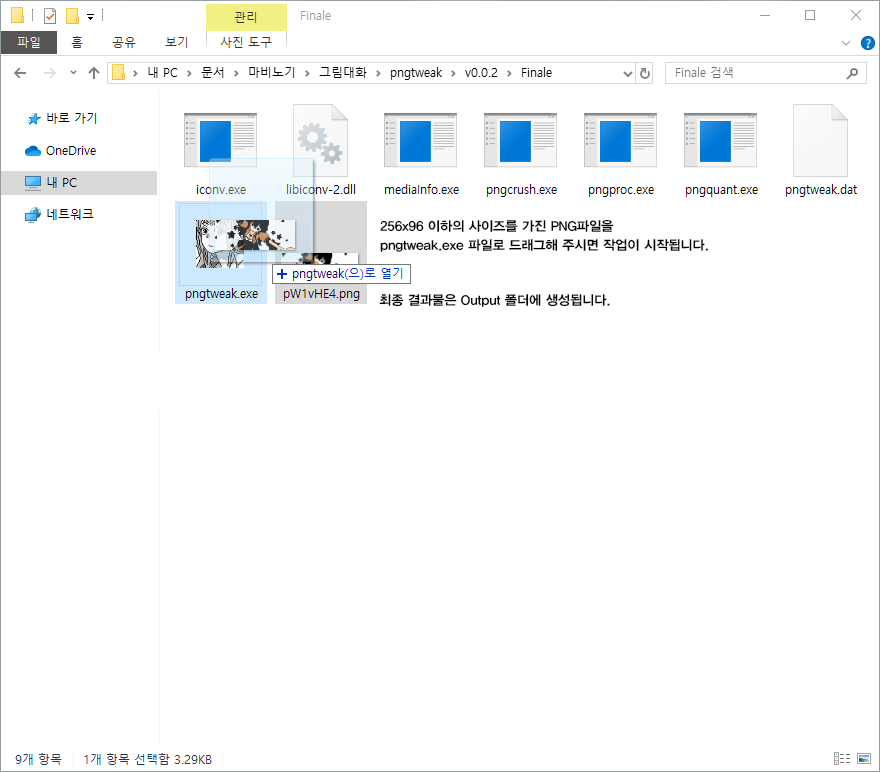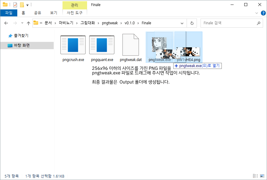 파일을 압축 해제하여 주신 다음 256x96 크기 이하의 PNG 이미지를 pngtweak.exe 로 드래그해 주시면 Output 폴더에 최종 그림대화 이미지 파일이 생성됩니다.